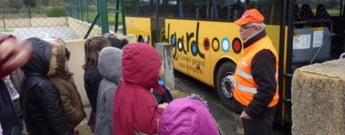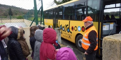 Deux des responsables de l'Association Départementale des Transports Educatifs du Gard ont débuté leur « tournée » avec les petits élèves de l'école d'Aigaliers. Après quelques questions simples posées sur la manière dont ils voyaient le bus, les enfants ont été invités à voir où et comment était le moteur et à prendre place avec leurs ceintures attachées correctement.