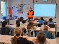 A notre arrivée tout est prêt, la salle, le projecteur et l'ordinateur. Les 6 classes défilent dans la salle de projection pour écouter, comprendre, participer aux échanges sur les différents dangers. Le principe « voir est être vu » pour éviter un accident est assimilé.