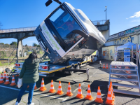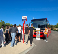 L'équipe des mobilités de la Communauté d'agglomération Arles Crau Camargue Montagnette est présente avec le conducteur du car de Transdev. Après les vidéos ce sont les exercices pratiques d'évacuation qui se déroulent dans le car.