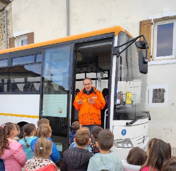 Jean-Luc et Bernadette Minel, les intervenants ont tout d'abord expliqué aux enfants autour d'un tapis interactif avec une maquette de car : les dangers rencontrés sur la route : voir et être vu, faire attention autour du car avec la roue Mangeuse de pied, les angles morts et comment faire attention à la descente. Ensuite c'est dans le car mis à disposition près de l'école qu'ils ont appris à être polis avec la conductrice, sortir rapidement en cas d'accident et l'importance de mettre sa ceinture. Une séance adaptée aux petits qui ont participé et posé des questions.