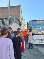 Pour la seconde fois l'Adateep du Gard se rend au collège Saint Félix de Beaucaire sur un site complétement rénové qui a été ouvert en septembre 2023. Le car mis à disposition par Kéolis est stationné près des classes.